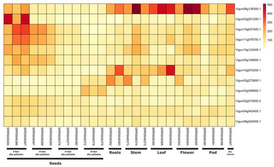 We further determined the basal expression of identified NLR genes in available transcriptome datasets of V. radiata and V. unguiculata. Whole transcriptome based assay are sparingly available due to paucity of scientific attention provided for legume species. Here we screened two transcriptome dataset with significant alignment score. For V. radiata dataset was acquired under bioproject number PRJNA779876 that includes 12 samples that compared the expression between two tissues shoot apex and young pod. Secondly, we further screened basal expression levels of NLR genes in V. unguiculata, where in total 28 sample were used to compared the expression between different tissues. We utilized the HISAT, Stringtie and Ballgown based alignment and quantification pipeline as already mentioned in previous article [,].