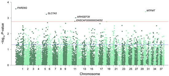 Manhattan plot for the transcriptome-wide significance of expression changes during aging. The threshold for transcriptome-wide significance was p < 0.05 and |log2FC| > 1 (blue line), but only the five most significant genes (above the red line) are labeled in this figure. A full list of significant genes is provided in Supplementary Table S2.