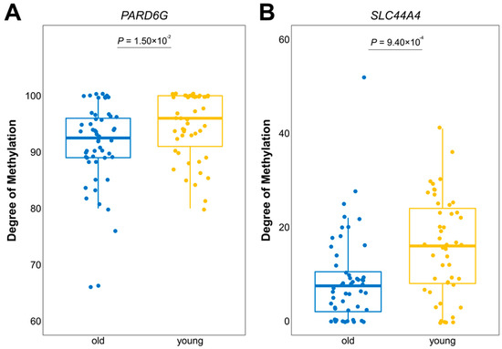 Aging-associated DNA methylation changes in the PARD6G (A) and SLC44A4 (B) genes. For both candidate genes, hypomethylation was observed in aged Labrador retrievers (6 > years old) compared to younger ones (6 < years old).
