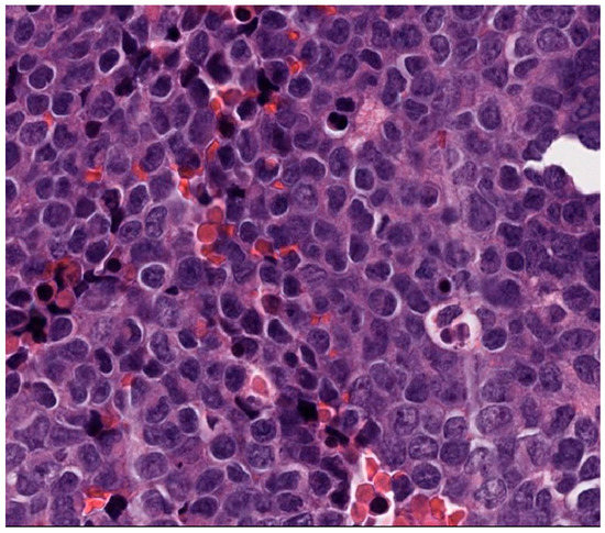 Histology of a humerus lesion in patient 3. The histologic evaluation shows monotonous small round blue cells with fine chromatin and scant amphophilic cytoplasm.