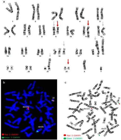 - Maire, G.; Brown, C.W.; Bayani, J.; Pereira, C.; Gravel, D.H.; Bell, J.C.; Zielenska, M.; Squire, J.A. Complex rearrangement of chromosomes 19, 21, and 22 in Ewing sarcoma involving a novel reciprocal inversion-insertion mechanism of EWS-ERG fusion gene formation: A case analysis and literature review. Cancer Genet. Cytogenet. 2008, 181, 81–92. [Google Scholar] [CrossRef]