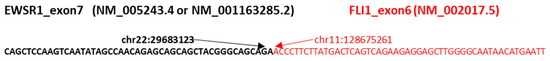 Visualization of the EWSR1::FLI1 fusion identified by the NanoString gene fusion assay in patient 1. The genomic translocation breakpoints were mapped to chr22:29,683, 123 (exon 7) for EWSR1 and chr11:128,675,261 (exon 6) for FLI1.