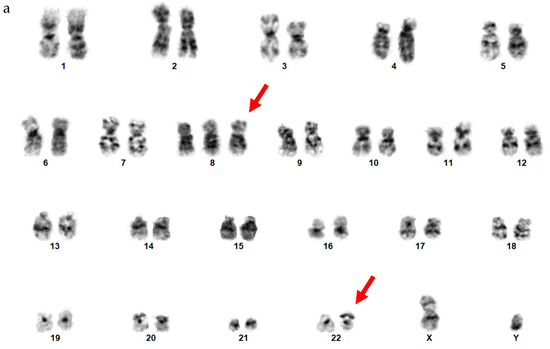 Conventional chromosome analysis/karyotyping (G-banded chromosome studies) was performed using standard techniques. A minimum of 20 metaphase cells were analyzed from tumor cultures. The abnormal karyotypes were described using the International System for Human Cytogenetic Nomenclature (ISCN 2020). Chromosome diagrams were drawn using the CyDAS package (http://www.cydas.org/, accessed on 1 April 2023).