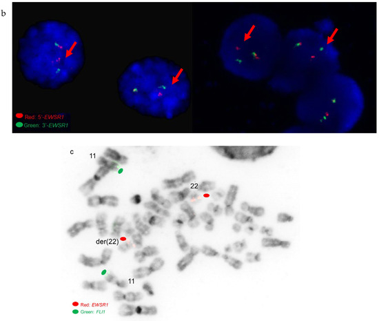 Fluorescence in situ hybridization (FISH) was performed on interphase nuclei and metaphase cells using break-apart probes of EWSR1 (Abbott Molecular, Inc., Des Plaines, Cook, IL, USA), dual-color, double-fusion probes of EWSR1::FLI1 (Empire Genomics, Inc., Williamsville, New York, NY, USA), and sub-telomere probes for 4qter, 11qter, and 22qter (Oxford Gene Technology, Inc., Begbroke Science Park, Kidlington, UK) according to the manufacturer’s protocol as previously described [11,15]. A total of 200 interphase nuclei and 20 metaphase cells per probe were visually evaluated with fluorescence microscopy by two technologists scoring blinded from each other using a Zeiss Axioscope system (Carl Zeiss Microscopy, LLC, Oberkochen, 73447, Germany).