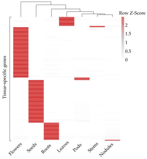 More tissue-specific genes were detected in flower and seed rather than root, stem, leaves, pod, and nodules. This may be related to the biological function of each tissue/organ. New organs were generated from a population of stem cells at the shoot and root apex that was maintained post-embryonically []. Flowers and seeds appeared during the reproductive phase with unique functions distinguished from other organs. Double fertilization was accomplished in flower, and the nutrient substances were transported to soybean seeds finally, which were not replaceable. The network of uptake and transport of inorganics and organics were carried out through vascular tissue [], and it usually existed in all vegetative tissues in shoots and roots. Compared with other tissues, studies about seed-specific expression in soybean have been widely reported [,,,,,,].