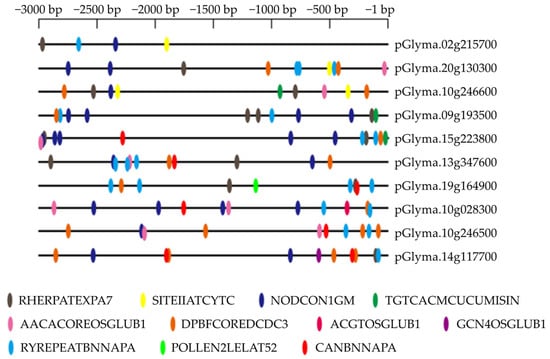 For cis-element analysis, the sequences of ten tissue-specific promoters (3 kb genome sequence upstream from the ATG) were retrieved in the New PLACE database. A total of 11 kinds of tissue-specific cis-elements were found (Figure 6). Several other tissue-specific elements existed in two leave-specific promoters pGlyma.02g215700 (with root-hair-, seed-, nodule-, and anther- and meristem-specific elements) and pGlyma.20g130300 (with four kinds of element in pGlyma.02g215700 as well as embryo- and endosperm-specific elements). Compared with pGlyma.20g130300, fruit-specific element was identified instead of the seed-specific element. Nodule- and root-hair-specific cis-elements harbored in both root-specific promoters. All of the five seed-specific promoters, pGlyma.10G028300, pGlyma.13G347600, pGlyma.14G117700, pGlyma.10G246500, and pGlyma.19G164900, contained seed-, embryo-, and endosperm-specific elements with a high proportion (71.2%) of all the elements. The pollen-specific element was detected in seed-specific promoter pGlyma.19G164900; anther- and meristem-specific elements existed in not only flower- but also two leaf-specific promoters. Embryo- and endosperm-specific elements occurred in nine promoters, except pGlyma.02g215700; and a nodule-specific element was found in nine promoters, except pGlyma.19G164900.