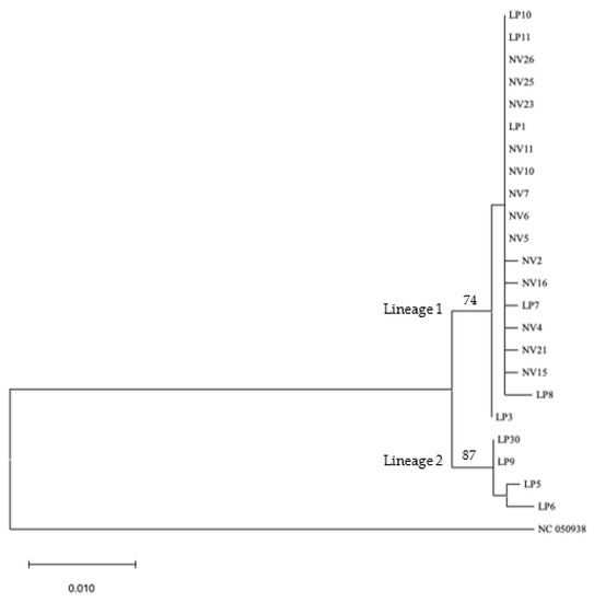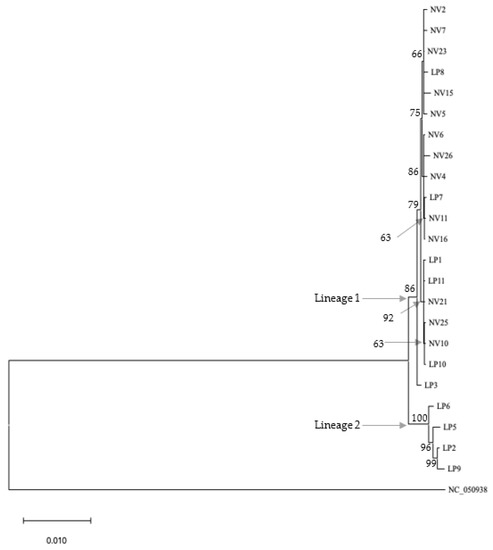 Maximum likelihood (ML) tree generated using combined sequence information from the 15 mitochondrial genes (with highest log likelihood equaling—21,231.33) from the 23 samples (13 NV and 10 LP). Bootstrap values above 50 are next to branches. Number of substitutions per site are indicated by the scale bar.