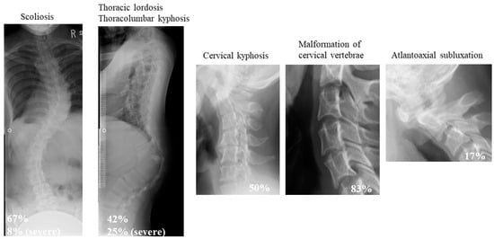 Early-onset kyphoscoliosis, a condition commonly found in mcEDS patients, often results in severe deformity, trunk balance deterioration, respiratory dysfunction, and digestive disorders. Thus, it is one of the most prominent symptoms reducing patient QOL and ADL and requires appropriate corrective treatment. Since the disease is characterized by progressive connective tissue fragility, there is concern that massive bleeding from hemorrhage and bone fragility may lead to implant dislocation and pseudoarthrosis during treatment. In a study summarizing the extent and characteristics of spinal deformity in 12 patients with mcEDS, cervical kyphosis (50%), cervical vertebral body deformity (83%), atlantoaxial subluxation (17%), advanced kyphosis at the thoracolumbar transition (42%), and scoliosis (67%) were found to be the most characteristic (Figure 1) [44]. Three (25%) patients had severe thoracolumbar kyphosis with a kyphotic angle of more than 50° along with thoracic lordosis and a wedge-shaped spinal deformity at the thoracolumbar junction; two of them underwent surgical correction of the deformity [44]. Bone tissue observation and bone morphometry revealed no calcification disorders and reduced bone metabolic turnover [38]. In another report of three surgical cases of severe spinal deformity in mcEDS, a tendency for massive subcutaneous hemorrhage and intraoperative bleeding due to fragile skin were problems specific to this condition [45]. Careful attention to positional changes and intraoperative hemorrhage control was necessary to address these problems [45]. Surgical planning was carried out considering a two-stage operation, with a total blood loss volume of 2 L. Additionally, 1-desamino-8-D-arginine vasopressin was also administered to prevent subcutaneous hematoma [45].