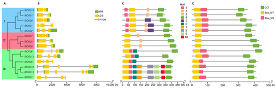 Motif distributions and exon-intron structures of COL family members in S. tuberosum. (A) COL phylogenetic tree of S. tuberosum; (B) exon–intron distribution of COL genes; (C,D) distribution characteristics of the conserved motifs of COL proteins; UTR, untranslated region; CDS, coding sequence.