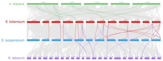 Syntenic relationships of COL genes in A. thaliana, S. tuberosum, S. lycopersicum and N. tabacum. Gray lines in the background indicate collinear blocks between S. tuberosum and other genomes, while red, green and purple lines highlight syntenic COL gene pairs. The chromosome number is indicated at the top of every chromosome.