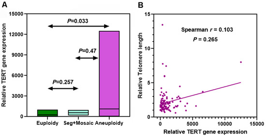 We isolated mRNA from the same blastocysts used to measure telomere length, and quantified the expression level of TERT mRNA, using the expression of GAPDH mRNA as a control. The levels of TERT mRNA in each blastocyst are shown in Supplementary Table S1. In concordance with telomere length comparison, the TERT mRNA level in aneuploid (median = 643.8; 95% CI [818.7, 1420]) was much higher than that in euploid blasts (median = 35; 95% CI [−512.7, 1050]) (Mann–Whitney test, p = 0.033; Figure 2A). TERT mRNA expression in segmental/mosaic did not differ from that in euploid or aneuploid blastocysts (Mann–Whitney test, p = 0.257 and p = 0.47, respectively; Figure 2A). Notably, significantly heterogeneous mRNA expression of TERT was observed in aneuploid compared to other blastocysts (Bartlett’s test, p < 0.01). Furthermore, we did not find a strong correlation between telomere length and TERT mRNA abundance (r = 0.103, p = 0.265; Figure 2B).