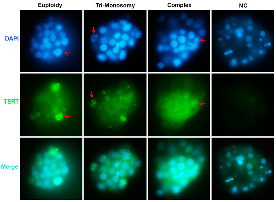 Immunofluorescent staining with anti-hTERT antibody in human blastocysts. NC represents negative control embryo stained only with secondary antibody. Red arrows point at the dividing cells with condensed anti-hTERT staining foci.