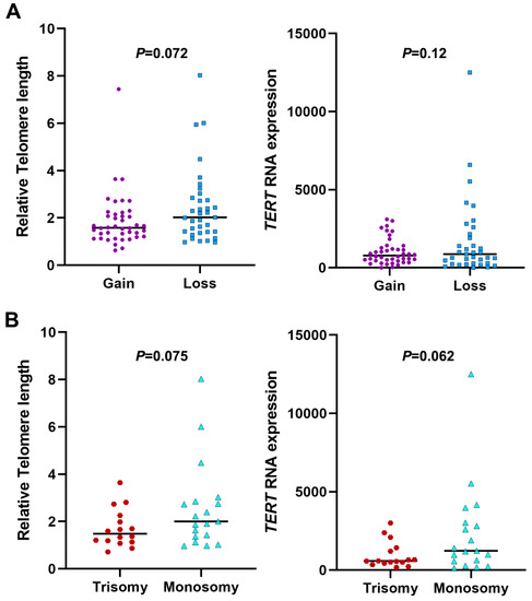 Next, we analyzed whether telomere length or telomerase gene expression differed in aneuploid embryos exhibiting chromosome gain vs. loss. Telomere length and telomerase gene expression did not differ between 42 blastocysts with chromosome gain (≥47) and 35 blastocysts with chromosome loss (≤45) (p > 0.05, t test; Figure 4A). Telomere length and telomerase gene expression did not differ between trisomic (Trisomy 22, 20, 16, 11, 8, and 2) and monosomic blastocysts (Monosomy 22, 20, 16, 11, 8, and 2) (p > 0.05, t test; Figure 4B). Interestingly, aneuploid blastocysts with fewer chromosomes tended to have longer telomeres than those with more chromosomes (p = 0.072 in chromosome gain and loss and p = 0.075 in trisomy and monosomy; t test) (Table 2 and Figure 4). The parental age did not differ between blastocysts with chromosome loss vs. gain (Table 2).