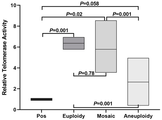 Comparison of relative telomere activity in human blastocysts. Pos represents telomerase positive control sample supplied by the assay kit. p value was calculated by t test on the GraphPad Prism 9 platform. The box bar represents from the minimum to maximum with mean value.
