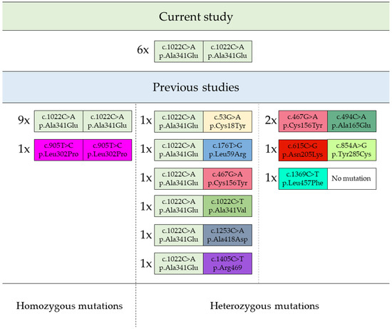 An analysis of mutations causative for the condition of patients in the current study led to interesting observations. Despite the fact that the genotype of each patient was found to possess a homozygous c.1022C>A (p.Ala341Glu) variant, which is the most frequently found among reported GPIBD2 patients, the dysmorphic features of the current group were diverse and differed significantly from a rather homogenous profile of patients from the previous studies. The above differences were not apparent in equal measure in terms of clinical image, whose main components were similar between the studies. The variety of mutations found in both the present patients and the previous 20 patients, for whom the precise genetic data were available, is presented graphically below in Figure 1 [10,11,12,13,14,15].