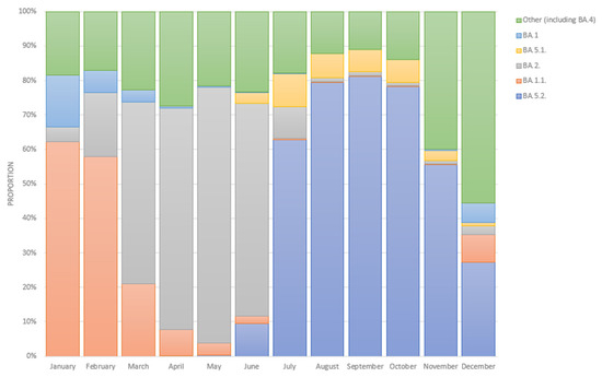 Month-wise breakdown of Omicron SARS-CoV-2 sublineages in Russia in 2022 (January–December, based on full-genome sequencing data) [18].