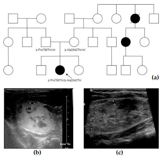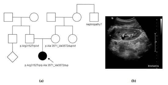 The proband (F1, III-2, Figure 1a) was the only child of non-consanguineous healthy parents. During her pregnancy, increased nuchal translucency was identified, and cytogenetic analysis on amniocytes revealed a normal female karyotype. Subsequent ultrasound (US) scans did not detect any other malformations. A few days after birth, abdominal US revealed enlarged and hyperechogenic kidneys with no corticomedullary differentiation, without any liver involvement. She was therefore addressed to our pediatric nephrology service and received periodical clinical and instrumental follow-up. No extrarenal manifestations were detected at the time of our report. At 12 years old (last clinical evaluation), she was normotensive and had normal estimated renal function (GFR 187 mL/min/1.73 m2) and urinalysis; her kidneys showed bilateral diffuse hyperechogenicity with multiple small cysts (Figure 1b). Family history was unremarkable except for a maternal uncle affected with an unspecified nephropathy. Her mother and father underwent an abdominal US study, at the ages of 44 and 41 years, respectively, and no renal cysts or other structural anomalies were detected. Further imaging (abdominal MRI or CT scans) was not performed in the parents. As informed consent was obtained, a blood sample was collected from the proband. Sequencing and MLPA analysis of PKHD1 and HNF1B were performed as a first basis but resulted negative. Afterwards, analysis of ADPKD genes revealed two previously unreported PKD1 heterozygous variants: p.Ala3571_Val3572dup and p.Arg3152Trp, whose configuration “in trans” was subsequently confirmed by parental segregation analysis (Table 1). The first variant is an extremely rare in-frame insertion located in a mutational hotspot, classified as likely pathogenic in VarSome and as VoUs in Franklin. The second one is a rare missense variant, an alternative to another likely pathogenic variant in the same codon (p.Arg3152Ser), classified as likely pathogenic in VarSome and VoUS in Franklin. No further genes were tested.