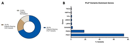 Regarding the global diagnostic status distribution, 69% of the total identified variants in our cohort of patients were pathogenic/likely pathogenic variants (Supplementary Tables S2 and S4), 18.4% were VUS variants (Supplementary Tables S3 and S5), and in 12.6% of patients we could not find any variants, see Figure 1, panel A. The majority of those pathogenic/likely pathogenic variants were found in dominant genes and, when we analyzed the involved genes, we found that, as expected, PKD1 and PKD2 were the most mutated ones, see Figure 1, panel B.