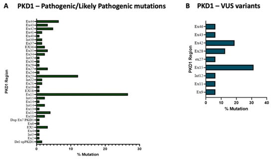 Regarding the VUS variants within PKD1, exons 15 and 42 are the most frequently mutated, accounting for 44.3% of total variants (Figure 2, panel B).