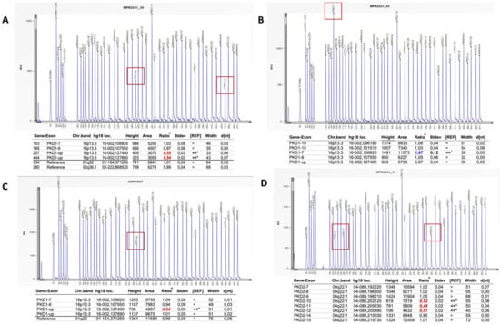 For those patients without variants classified as pathogenic, likely pathogenic or VUS, we proceeded by analyzing exon 1 by Sanger sequencing and successively analyzing large gene rearrangements by MLPA (Figure 4). No mutations were found in exon 1. MPLA analysis identified three patients with large rearrangements in PKD1: two with large deletions (Figure 4, panels A,C) and one with duplication (Figure 4, panel B). In addition, one patient had a large deletion in PKD2 (Figure 4, panel D).