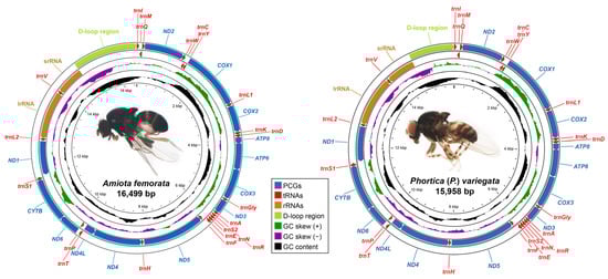 Graphical maps of the mitochondrial genomes (mitogenomes) of the representative Amiota (Amiota femorata Chen & Takamori) and Phortica species [Phortica (Phortica) variegata (Fallén)], respectively. The genes outside the outermost circle are transcribed clockwise, whereas the genes inside the outermost circle are transcribed counterclockwise. The inside circles show the G + C content and the GC-skews.