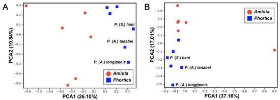 Principal component analyses (PCAs) based on (A) the sizes of genes and (B) the sizes of intergenic nucleotides (IGNs) in the Amiota and Phortica mitogenomes.