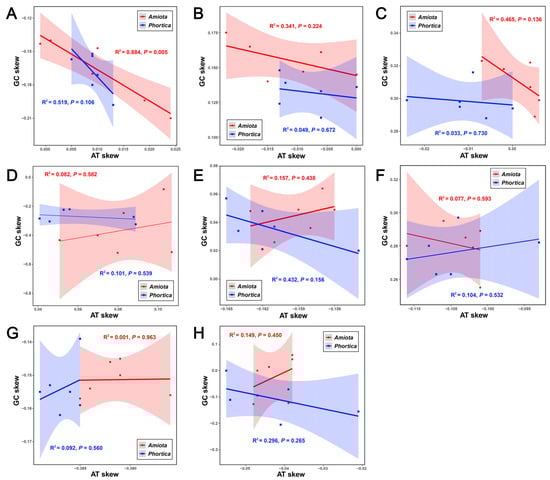 Linear correlation analyses between the AT-skews and the GC-skews of different regions/genes in the Amiota and Phortica mitogenomes. (A) The majority strands (J-strands) of whole mitogenomes. (B) Thirteen protein-coding genes (PCGs). (C) Thirteen PCGs (1st codon positions). (D) Thirteen PCGs (2nd codon positions). (E) Thirteen PCGs (3rd codon positions). (F) Twenty-two tRNAs. (G) Two rRNAs. (H) The D-loop regions (J-strands).