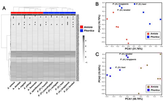 Genetic characteristics of the codon and the amino acid usage of all the PCGs in the Amiota and Phortica mitogenomes. (A) Heatmap and clustering analysis of the codon usage. Pound (#): absent codon. (B) PCA based on the relative synonymous codon usage (RSCU) values. (C) PCA based on the codons per thousand codons (CDspT) values.