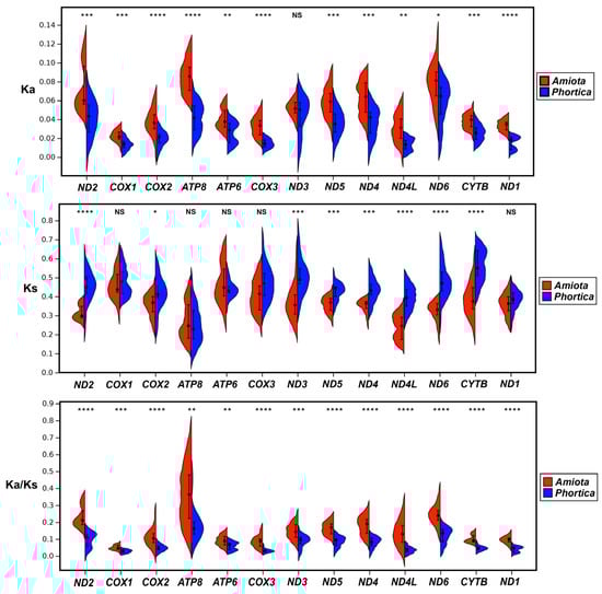Nonsynonymous substitutions per nonsynonymous site (Ka), synonymous substitutions per synonymous site (Ks), and Ka/Ks (ω) values of all the PCGs in the Amiota and Phortica mitogenomes. In all analyses, (*) p < 0.05, (**) p < 0.01, (***) p < 0.001, (****) p < 0.0001, (NS) not significant.