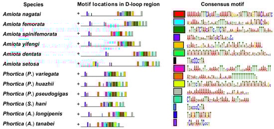 Moreover, we identified some consensus motifs that showed distinct genus-specific patterns. For example, a “TWTWWYTMTHWAATAWWTAWYWTWWWTWHWHMTATATWTATWTAYADRH” consensus motif (motif 10, the yellow-green box in Figure 6) located in the downstream region approximately 300 bp away from trnI was found only in the Phortica D-loop sequences. Based on the above results, we are convinced of the importance of the genus-specific characteristics and evolutionary implications provided within the D-loop regions of the Amiota and Phortica mitogenomes. Although the D-loop regions were highly variable, their downstream conserved regions could be partly aligned to reflect the phylogenetic positions that were altered by evolutionary driving forces throughout evolution.