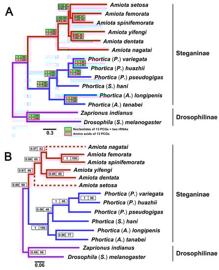 In this study, the phylogenetic relationships of three mitochondrial data sets of the 12 Steganinae and two Drosophilinae species were recovered (Figure 7). For the data set based on the nucleotides of 13 PCGs and two rRNAs and the data set based on the amino acids of 13 PCGs, the concatenated sequences were divided into 20 and six subsets using the best-fit substitution models, respectively (Table S7). These two large data sets accounted for most of the genetic information in the mitogenomes. Overall, both the final Bayesian inference (BI) and maximum likelihood (ML) trees of these two data sets displayed an entirely identical topology, and most nodes were strongly supported (posterior probabilities, PPs = 1.00, ultrafast bootstrap percentages, UBPs = 100) (Figure 7A). The monophylies of the Steganinae, the Drosophilinae, the Phortica, and the Amiota were all well supported (PPs = 1.00, UBPs = 100). The phylogenetic relationships within the Phortica were also attached with high confidence (PPs = 1.00, UBPs = 100) with the exception between P. (P.) huazhii and P. (P.) variegata in the ML analyses (UBP = 99 for the nucleotides, UBP = 86 for the amino acids) (Figure 7A). The subgenera Phortica and Shangrila showed a closer relationship compared with the Ashima, which is consistent with the latest phylogenetic analysis concerning the Phortica [26]. A. nagatai (the nagatai species group) was primarily separated from the clade of the remaining five Amiota species (PP = 1.00, UBP = 100 for the nucleotides, PP = 0.91, UBP = 90 for the amino acids) (Figure 7A). The topology within this clade was supported in the BI (PPs = 0.60–1.00) but not well supported in the ML analyses (UBPs = 38–50). Nevertheless, all four trees reached a consensus on the close relationships between A. setosa (the alboguttata species group) and A. femorata + A. spinifemorata (the taurusata species group), and between A. yifengi (the basdeni species group) and A. dentata (ungrouped species) (Figure 7A).