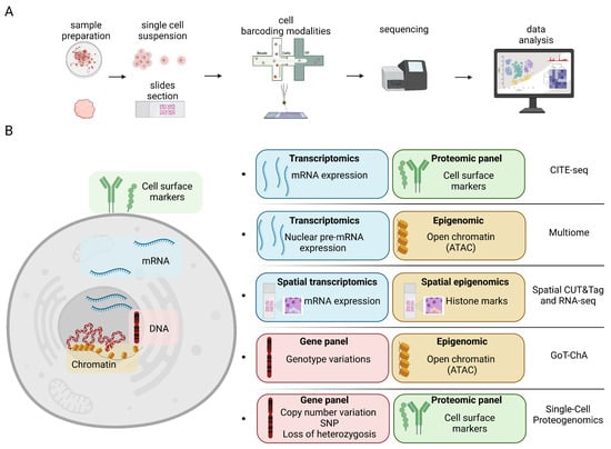 Single-cell (SC) biology is a rapidly evolving field that interrogates various omics layers (genomics, epigenomics, transcriptomics, proteomics) (Figure 1) at SC resolution to define cellular heterogeneity in homeostasis and disease [1,2,3,4,5,6,7,8]. The correlation between epigenetic and genetic information, along with the analysis of phenotype through proteomic analysis, plays a critical role in uncovering the complex associations between molecular variations and observable traits. Integrating these diverse layers of molecular data allows for a comprehensive analysis of the interplay between genotype [9] and phenotype [10,11,12]. Consequently, the development of novel tools that enhance the precision and output of genotyping and phenotyping techniques holds substantial importance.