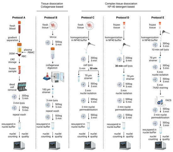 In order to ensure reliable results that provide the resolution and quality necessary to make meaningful scientific conclusions and to improve reproducibility, experimental protocols need to be optimized, evaluated, and standardized. This proves to be a challenge because several factors could affect the quality of the analyzed samples, leading to poor data quality. These include the type of tissue (PBMC, tumor, bone marrow, or cell line) which can impact the nuclear isolation protocol; the biological condition being studied (homeostasis, development, cancer, infection, or inflammation); the method of sample collection, handling, storage, and maintenance; cell viability and the number of cells available. Moreover, most protocols are typically defined using ideal samples that do not reflect the clinical and translational research environment, the so-called “real world” samples [12].