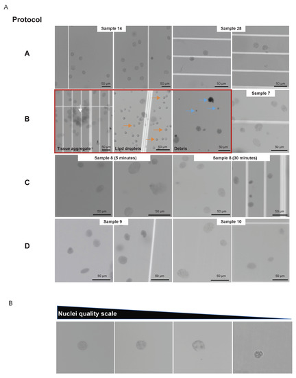 Representative images of single nuclei from the various protocols and samples examined in this study. (A) Protocol A shows nuclei isolated from PBMC (samples 14 and 28). Protocol B shows nuclei prepared from ovarian cancer tissues. Shown in order are examples of eliminated samples (inside red square) with undigested tissue aggregates (white arrow), lipid droplet contaminants (orange arrow), and debris (blue arrow), as well as a successful nuclei preparation (sample 7). Protocol C shows nuclei isolated with a 5 min incubation and 30 min incubation from sample 8. Protocol D shows nuclei preparation from samples 9 and 10. (B) Representative images of single nuclei organized in decreasing order of preparation quality were used as a standard. Scale bars throughout represent 50 μm.
