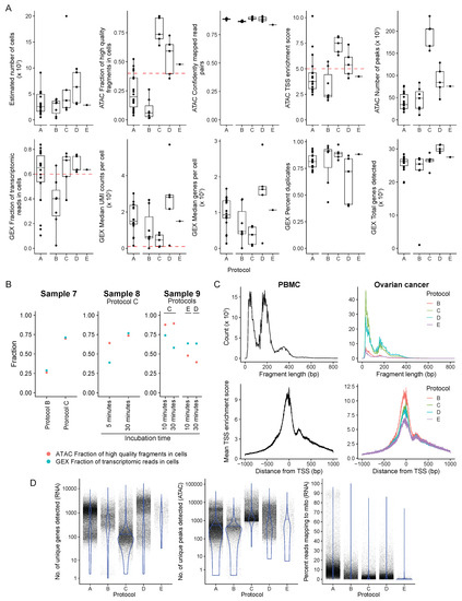 Quality control statistics comparing the protocols examined. (A) QC statistics reported by Cell Ranger ARC per sample grouped by protocol, shown as a boxplot where the middle line represents the median, the lower and upper edges of the rectangle represent the first and third quartiles and the lower and upper whiskers represent the interquartile range (IQR) × 1.5. Outliers beyond the end of the whiskers are plotted individually. Protocol A, n = 18; Protocol B, n = 7, Protocol C, n = 5; Protocol D, n = 5; Protocol E, n = 1. 10x genomics thresholds are represented by red dashed lines. (B) The fraction of high-quality fragments in cells (ATAC) and a fraction of transcriptomic reads in cells (GEX) are shown for samples 7, 8, and 9, for which paired protocol and different incubation time comparisons were made. (C) Fragment length distribution and mean TSS enrichment score—the ratio of fragments centered at the TSS to fragments in TSS flanking regions from all samples grouped by tissue and protocol. (D) Violin plots showing the number of unique genes detected (RNA), number of unique peaks detected (ATAC), and the number of reads mapping to mitochondrial genes (RNA) calculated per cell in all samples and grouped by protocol. Protocol A, n = 57,817; Protocol B, n = 17,277; Protocol C, n = 33,759; Protocol D, n = 31,623; Protocol E, n = 2853.