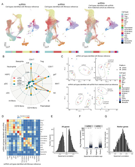 Comparison of the transcriptomes profiled from snATAC + snRNA (GEX) and scRNA-seq from a matched cohort. (A) UMAP projection showing 70,184 cells from scRNA colored by cell types identified using SingleR with Monaco reference (left) and 43,160 cells from snRNA, cell types identified using Monaco reference (middle) or using scRNA from the matched cohort as reference (right). The bar at the bottom shows the proportion of each cell type identified using each method. Treg, regulatory T-cells; gdT, gamma delta T-cells; MAIT, Mucosal-associated invariant T cells; NK, natural killer cells; Mono, monocytes; Int, intermediate; cDC, classical dendritic cells; pDC, plasmacytoid dendritic cells; HSPC, hematopoietic stem, and progenitor cells. (B) Radar plot showing the comparison of proportions of each cell type identified by each method. (C) Principal component analysis of the transcript counts aggregated by platform and cell type with snRNA cell types identified using Monaco reference (top) and scRNA from matched cohorts as reference (bottom). (D) Heatmap showing the log (base 10) of the number of cells that overlap cell type identification by the two references—Monaco and scRNA from matched cohort. (E) Histogram showing the distribution of genes significantly correlated (Spearman correlation, test for association p < 0.05) in expression (averaged over both sample and cell type) between scRNA and snRNA. (F) Log (base 10) average expression (averaged over all cells) of genes separated by positive and negative Spearman correlation coefficients. (G) Histogram showing the distribution of marker genes significantly correlated (Spearman correlation, test for association p < 0.05) in average expression between scRNA and snRNA.