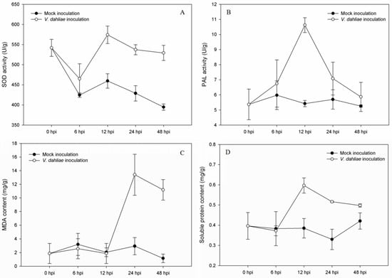 Determination of SOD (A), PAL (B), MDA (C), and soluble protein (D) in the roots of S. sisymbriifolium measured at 0, 6, 12, 24, and 48 h post-inoculation (hpi) with V. dahliae and water (mock inoculation).