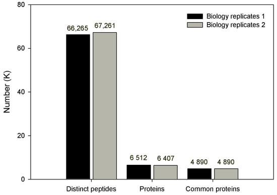 According to the standards of protein identification, a total of 6512 and 6407 proteins were identified from 66,265 and 67,261 peptides (from 2 biological replicates) by searching against a plant database in NCBI. Among them, 4890 proteins were commonly identified in 2 biological replicates (Figure 2 and Table S1).