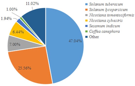 Of the 4890 proteins, 4842 proteins (99.02% matching ratio) were successfully annotated by BLAST analysis in NCBI public databases. The species annotation of all matching proteins demonstrated that the first six species annotated accounted for 88.98% of all proteins. Among these annotated species, S. tuberosum accounted for 47.04%, and S. lycopersicum accounted for 25.56%; they both belong to the Solanum spp., and they accounted for 72.60% overall (Figure 3).