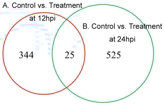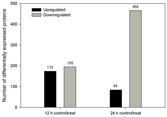 A total of 369 DEPs were identified in the comparison between control and treatment groups at 12 hpi, with 195 being downregulated and 174 upregulated (Figure 4 and Table S2). At 24 hpi, 550 DEPs were identified in the comparison between control and treatment groups, with 466 being downregulated and 84 upregulated (Figure 4 and Table S3). There were 25 overlapping DEPs in the two comparisons by a Venn diagram, with 11 commonly downregulated, 3 commonly upregulated, and 11 first upregulated then downregulated (Figure 5 and Table S4).