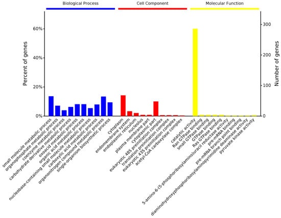 Among the 550 DEPs in the comparison between the control and treatment group at 24 hpi, 844, 160, and 485 (192, 22, and 87, p-value < 0.05) were involved with terms in the biological process, cellular components, and molecular function groups (Table S6), respectively. We found that the most significant enrichment terms were the small molecule metabolic process (p = 4.61 × 10−10), organophosphate metabolic process (p = 2.60 × 10−7), and coenzyme metabolic process (p = 6.47 × 10−7) in the biological process group (Figure 7). Correspondingly, most DEPs were also enriched in the cytoplasm (p = 1.18 × 10−5), observed with the lowest p-value in the cellular component group. The molecular function group enrichment results showed that most proteins involved in catalytic activity (p = 1.90 × 10−7) and GTPase binding (p = 2.08 × 10−4) were DEPs (Figure 7).