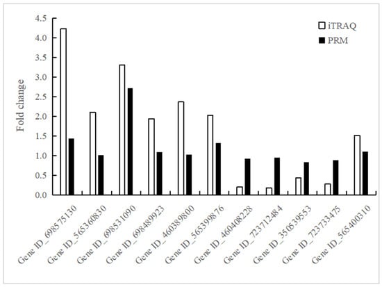 In this study, the expression levels of some proteins were quantified by LC-PRM/MS analysis to confirm the iTRAQ data. Twelve candidate proteins related to resistance to verticillium wilt were selected for PRM analysis. Among 12 target candidate proteins, 11 proteins were identified as unique peptides with MS/MS spectrum, and they are proteins involved in the defense responses, such as peroxidase, glycine-rich RNA-binding protein, glutathione s-transferase, and auxin-induced protein. In general, the trends in the change in the expression levels of 11 proteins detected by PRM and iTRAQ are basically consistent (Figure 9). However, there are some differences between the values in iTRAQ and PRM data, which may be due to their different detection and analysis methods.