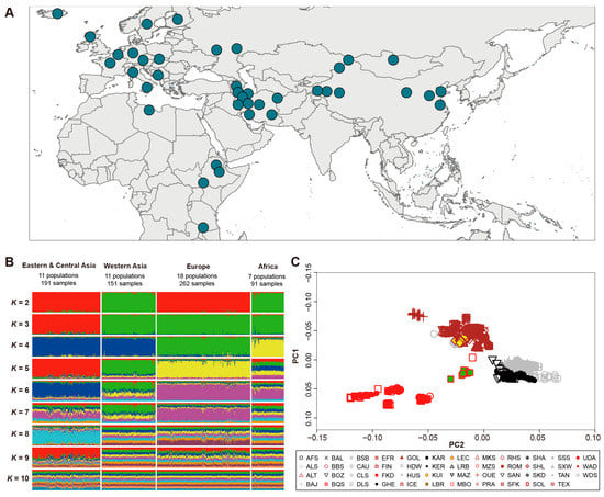 - Patterson, N.; Price, A.L.; Reich, D. Population Structure and Eigenanalysis. PLoS Genet. 2006, 2, e190. [Google Scholar] [CrossRef]