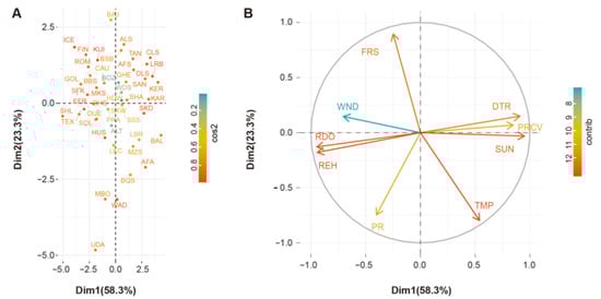 PCA of environmental variables. (A) Projection of the nine climatic variables based on 47 worldwide autochthonous populations. The representation of the variable is quantified by cos2, and a high cos2 indicates a good representation of the variable on the principal component. (B) Projection of the nine climatic variables on the first and second factor planes. SUN: percent of maximum possible sunshine; DTR: mean diurnal temperature range in °C; REH: relative humidity in percentage; PR: precipitation in mm/month; TMP: mean temperature in °C; PRCV: the coefficient of variation of monthly precipitation in percent; FRS: number of days with ground frost; WND: 10 m wind speed in m/s; RDO: number of days with >0.1 mm rain per month. Contributions of variables to PCs are shown by the colors bar.