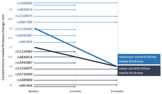 Carotid intima-media thickness is a surrogate marker for the presence and progression of atherosclerosis and is useful for evaluating the risk and incidence of cardiovascular disease [17]. A causal relationship between LDL-C and CIMT has been observed [18], and CIMT is being considered a marker of preclinical atherosclerosis [18,19]. A growing body of evidence has been provided to consider CIMT as a predictive marker for coronary artery atherosclerosis, its severity, and the extent of plaque burden [20,21,22,23]. Importantly, rosuvastatin may reduce not only CIMT but also atherosclerotic plaque growth [24,25]. It is impossible to claim definitively whether the hypolipidemic effects of rosuvastatin are solely responsible for the regression of atherosclerosis because the pleiotropic effects of the drug may contribute to arterial wall changes through inflammation reduction [25,26]. The mechanisms by which rosuvastatin is responsible for vascular wall changes may be unraveled by pharmacogenetic studies; however, a majority of such studies have investigated only the lipid-lowering effects of the drug [13,14,27,28]. Our research team has conducted several studies on the effect of gene polymorphisms on plasma lipids and CIMT, as well as the dynamics of their changes during rosuvastatin lipid-lowering therapy [29,30,31]. It has been discovered that some lipid-associated GWAS loci contribute to the lipid-lowering effects associated with rosuvastatin therapy and determine CIMT regression. Without a doubt, CIMT seems to be a surrogate marker of atherosclerosis in CAD patients, despite the fact that it correlates with disease severity [20,21,22,23]. However, in terms of clinical application, CIMT regression during rosuvastatin therapy may mirror vascular wall changes and be indicative of drug efficacy. The aim of our pharmacogenetic study was to identify the effects of fifteen lipid-associated GWAS loci such as rs4846914 (GALNT2), rs11220463 (ST3GAL4), rs881844 (STARD3), rs1689800 (ZNF648), rs12328675 (COBLL1), rs9987289 (PPP1R3B), rs55730499 (LPA), rs3136441 (F2), rs6065906 (PLTP), rs838880 (SCARB1), rs386000 (LILRA3), rs1883025 (ABCA1), rs3764261(CETP), rs217406 (NPC1L1), and rs16942887 (PSKH1) on plasma lipids and CIMT in CAD patients taking rosuvastatin. These loci have recently been observed to be associated with CAD susceptibility and CIMT [32].