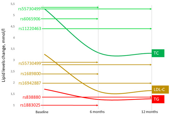 Associations of single nucleotide polymorphisms with lipid-lowering effect of rosuvastatin in coronary artery disease patients at 6 and 12 months of therapy. TC, total cholesterol; LDL-C, low-density lipoprotein cholesterol; TG, triglyceride levels. The bold lines show lipid fraction change (mmol/L), and the length of the arrows depicts the effects of single nucleotide polymorphisms, observed at 6- and 12 months. The color of the arrows shows the influence of the SNPs on TC (green), LDL-C (brown), or TG (red) reduction.