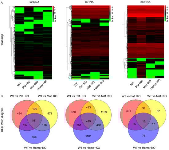 Analysis of differentially expressed genes (DEGs) in WT and CRISPR/Cas9-mediated Meg8-DMR knockout mice. (A) Heat map of LncRNA, mRNA, and miRNA DEGs in WT and Meg8-DMR knockout mice. From left to right: lncRNA, mRNA, and microRNA; The horizontal coordinate represents the sample name and the clustering result of the sample, and the vertical coordinate represents the differential gene and the clustering result of the gene. Different columns in the diagram represent different samples, and different rows represent different genes. The color represents the level of gene expression in the sample log10 (gene + 0.000001). (B) Venn diagram of DEGs in Pat-KO (red), Mat-KO (yellow), and Homo-KO (blue) mutants compared to the wild-type. From left to right: lncRNA, mRNA, and microRNA.
