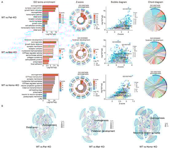 To further understand the effects of Meg8-DMR at the embryonic stage, we compared Pat-KO, Mat-KO, and Homo-KO mutants with WT using GO and KEGG pathway enrichment analysis. We used the top 12 GO terms for comparative analysis. The results of microRNA-associated DEGs analysis in Pat-KO and Homo-KO suggest that the biological processes of these genes were mainly involved in axonogenesis and forebrain development in Mat-KO (Figure 4A). The network diagram and relationships between DEG and the top 12 GO enrichment results showed that axonogenesis was located at the central node of the network (Figure 4B). Taken together, the GO and KEGG pathway enrichment analysis of DEGs in mutations revealed that Meg8-DMR played a role in the axonogenesis and forebrain development of mice.