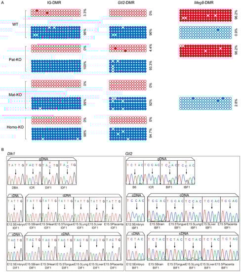 DNA was isolated from the embryo of WT, Pat-KO, Mat-KO, and Homo-KO mutants. Sequencing was performed as described previously. The primers used were as follows: IG-DMR, forward 5′-GTATTGTAATATAGGTTAGGTG-3′, reverse 5′-CTACATAATACCATATAAACATATCTC-3′. Gtl2-DMR, forward 5′-AAATTCTGCAAGGAAAAGAATCCTCAGG-3′, reverse 5′-TTCAGAATTGCTGGTCAACATGAACCTC-3′. Meg8-DMR, forward 5′-AGTTGGGTTATTTAAGATTTGTGTT-3′, reverse 5′-AATTTCCTAAACTCCTAACCACTTC-3′.