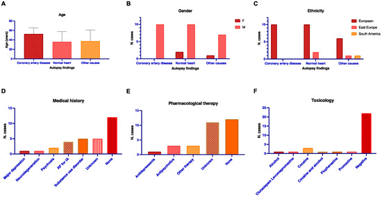Age ((A), median and interquartile range), gender (B), and ancestry (C) as distributed according to autopsy findings groups are reported in the upper part of the figure. Number of cases divided according to medical history (D), therapy (E), and toxicology of the analyzed cases (F) are reported in the lower part. N: number. F: female. M: male. RF: risk factors for cardiovascular diseases. IA: ischemic attack. Other therapy: medications for diabetes and cardiovascular factors.